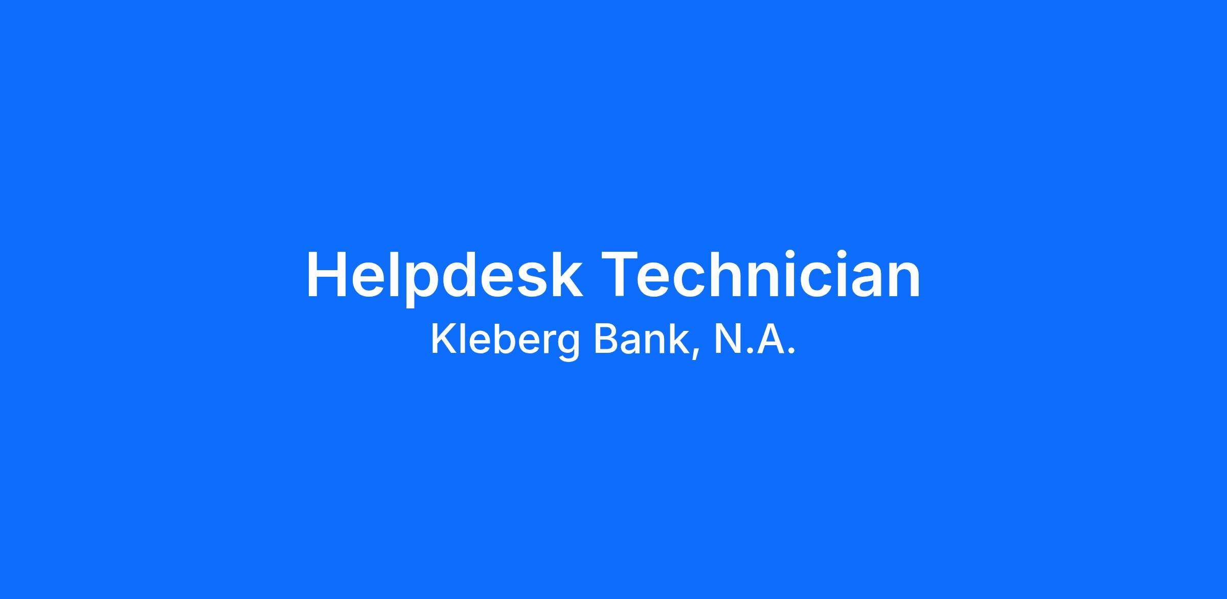 Kleberg Bank, N.A. believes that the customer’s experience is our Brand. Each individual at Kleberg Bank, N.A. is committed to providing “Excellent” customer service. The Helpdesk Technician role reports directly to the Bank's IT Manager. The Helpdesk Technician uses interpersonal, communication, and technical skills. The technician will diagnose and resolve issues by asking probing questions, and also by using the knowledge base, remote access, and enterprise tools. The Helpdesk Technician will increase employee efficiency and Kleberg Bank competitiveness through technology support.