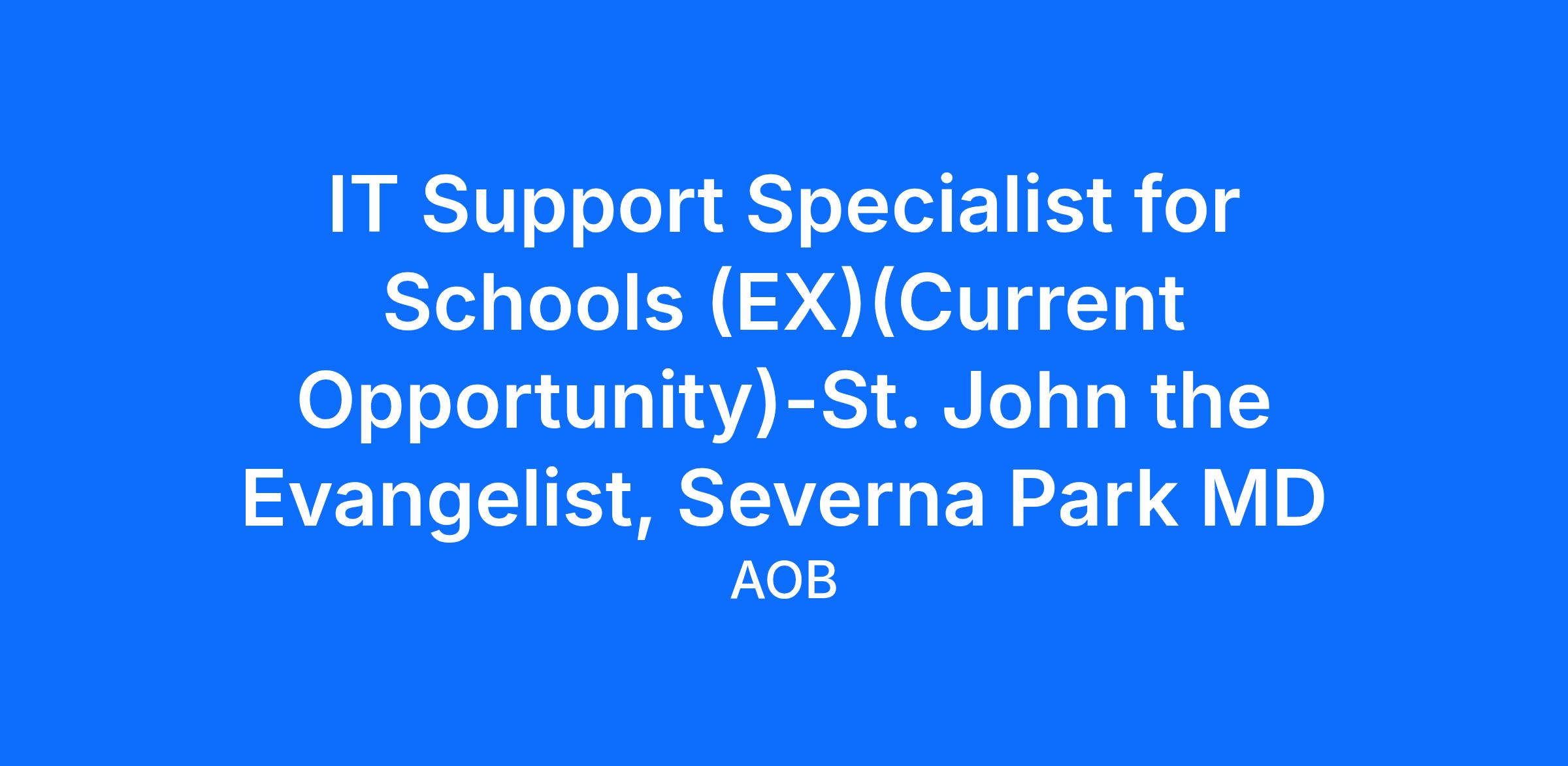 St. John the Evangelist, located in Severna Park, Maryland, is seeking a qualified fullâtime IT Support Specialist. The IT Support Specialist is responsible for providing technical assistance and support related to computer systems, hardware, and software. This position serves as the first level of support for faculty, staff, and students. Primary responsibilities include delivering IT Helpdesk services, maintaining the computer desktop environment, troubleshooting and resolving endâuser issues, and installing hardware and software. This position is expected to start May 1, 2026.